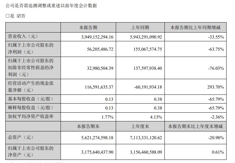 财报显示,今年上半年,公司营业收入为39.5亿元,同比下降33.6%;归属于上市公司股东的净利润约为5621万元,同比下降63.8%;归属于上市公司股东的扣非净利润约为3298万元,同比下降76.0%。