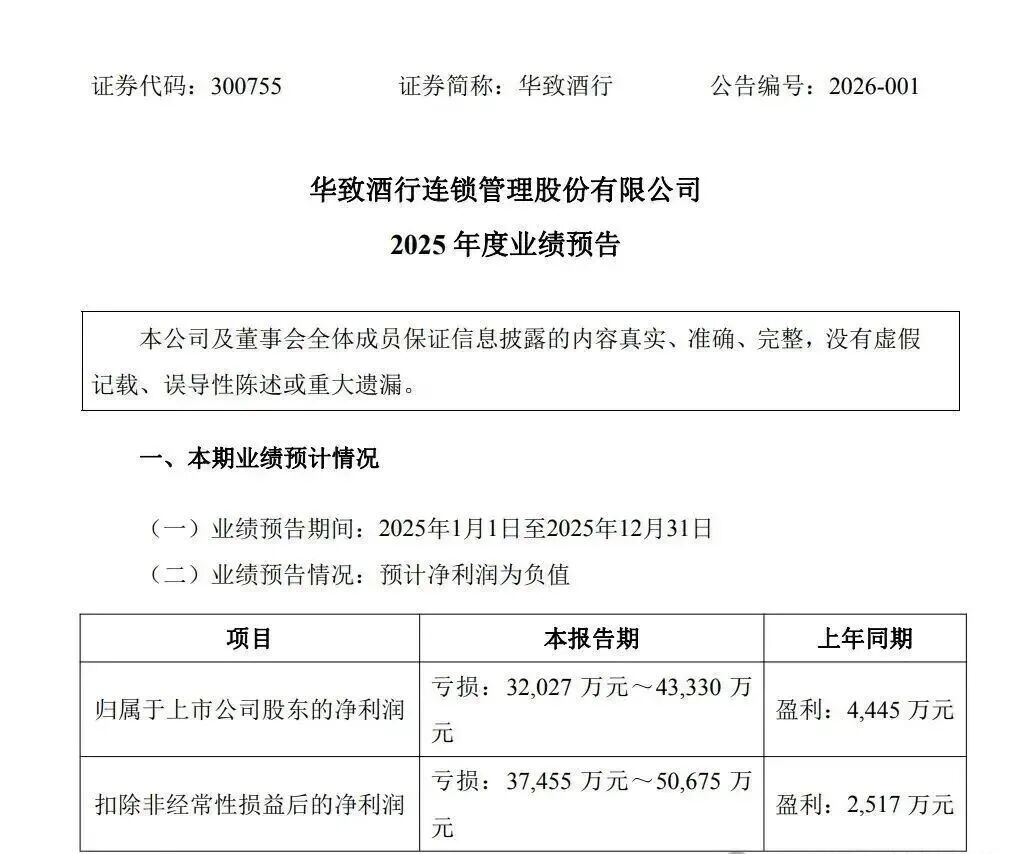 1月30日晚间,国内酒类流通龙头华致酒行发布了一份令市场震惊的业绩预告:预计2025年归属于上市公司股东的净利润亏损约3.2亿元至4.33亿元,同比由盈转亏。