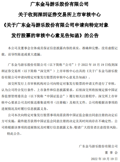 深交所发行上市审核机构对金马游乐向特定对象发行股票的申请文件进行了审核,认为金马游乐符合发行条件、上市条件和信息披露要求,后续深交所将按规定报中国证监会履行相关注册程序。深交所上市审核中心要求金马游乐及时报送募集说明书(注册稿)及相关文件,公司将根据该事项的进展情况及时履行信息披露义务。