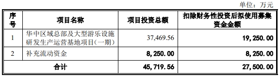 金马游乐2022年9月9日披露的2021年度向特定对象发行股票募集说明书(申报稿)显示,公司本次发行股票募集资金总额不超过27,500.00万元(含本数)(系扣除财务性投资后金额),在扣除发行费用后拟全部“华中区域总部及大型游乐设施研发生产运营基地项目(一期)”和“补充流动资金”。