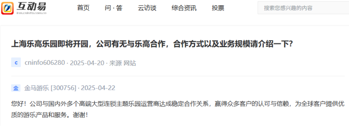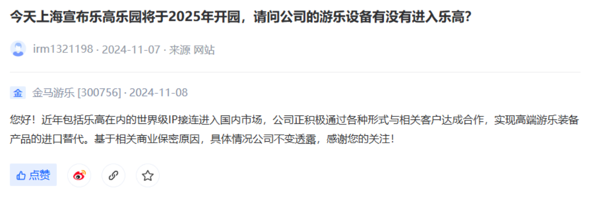 虽然金马游乐在互动平台表示,正积极通过各种形式与包括乐高在内的相关客户达成合作,但目前尚未有明确的重大合作项目或深入的业务融合,其业务主要还是围绕自身的大型游乐设施与虚拟沉浸式游乐项目等展开。
