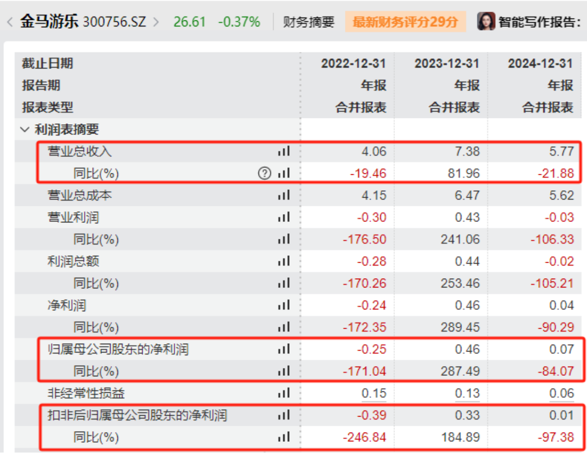 据2024年年报,金马游乐2024年营收5.77亿元,同比下降21.88%,主要因为交付订单以中小型产品为主。需要指出的是,金马游乐去年归母净利润和扣非净利润同比分别下滑了84.07%和97.38%。