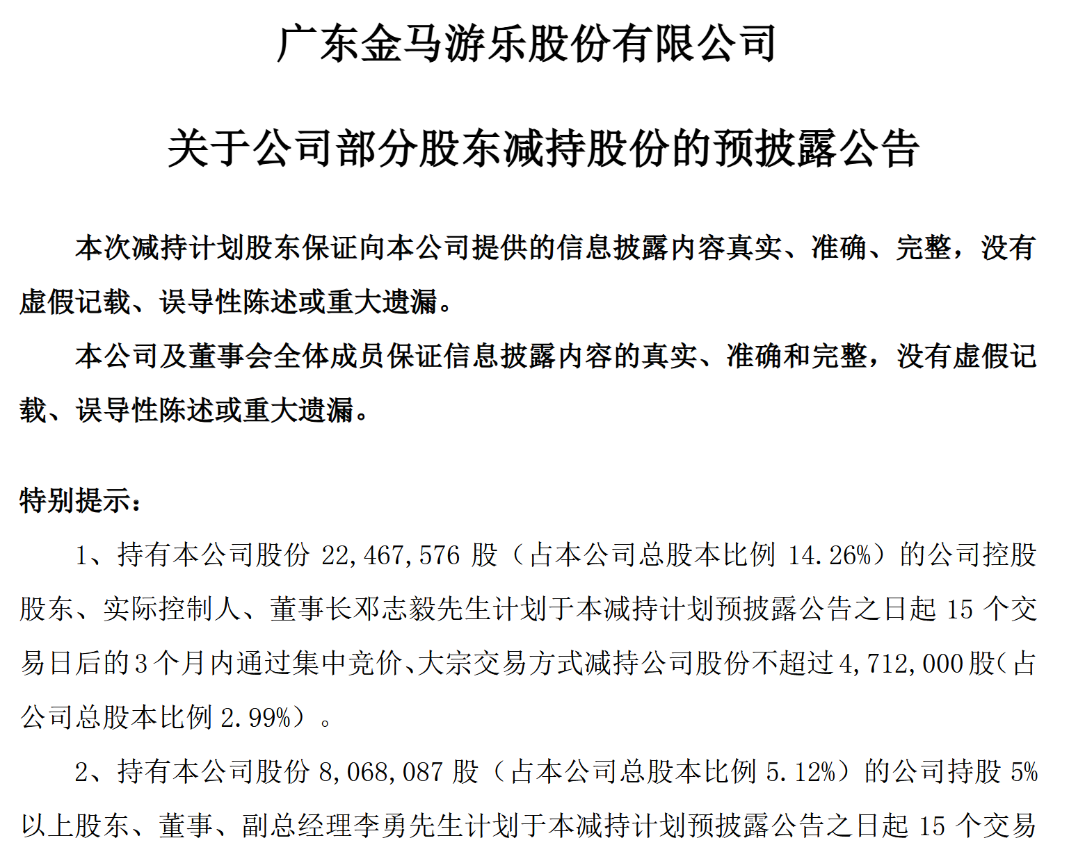 7月20日晚间,金马游乐公告称,公司实控人、董事长邓志毅计划减持公司股份不超过471.2万股(占公司总股本的2.99%);公司董事、副总经理李勇计划减持公司股份不超过201.7万股(占公司总股本的1.28%);公司副总经理林泽钊计划减持公司股份不超过50.82万股(占公司总股本的0.32%);公司董事、总经理高庆斌计划减持公司股份不超过37.28万股(占公司总股本的0.24%)。上述四名实控人和高管拟合计减持不超过4.83%公司股份。