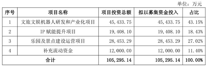 本次定增预案的资金分配,清晰勾勒出金马游乐的转型路径。募集资金扣除发行费用后,将重点投向四大方向:文旅文娱机器人研发和产业化项目拟投入4.54亿元,占募资总额的43.1%,成为绝对核心;乐园及景点建设运营项目、IP赋能提升项目分别规划2.85亿元、1.94亿元,剩余1.2亿元用于补充流动资金。