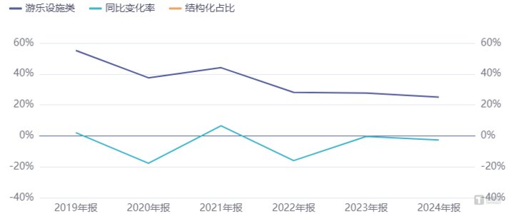 业绩剧烈波动的核心,在于占营收超90%的核心主业游乐装备制造业务盈利能力持续下滑。该业务的毛利率从2019年的55.22%降至2024年的31.13%,累计下滑超过20个百分点。