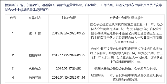 首先,相关财团出现存续期即将临近。本次交易对方包括建广广智等 7 家有限合伙企业,建广广智、永鑫融合、超越摩尔及(宁波)投资中心(有限合伙)(以下简称尚融宝盈)的合伙期限分别将于 2024 年或 2026 年到期。