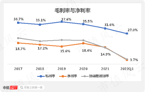 毛利率从2019年以后连年下滑,2022年前三季度为27%,较2017年已下滑近10个百分点,净利率更夸张,2022年前三季度仅为3.7%。