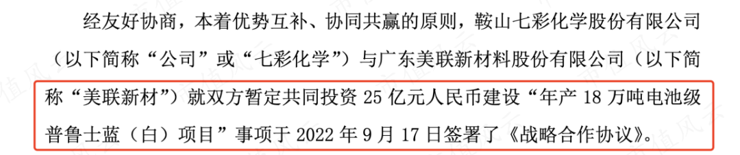 公司9月18日发公告,称与美联新材(300586)已签订战略合作协议,双方暂定共同投资25亿,建设年产18万吨电池级普鲁士蓝(白)产业化项目。