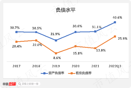 2020年公司资产负债率开始走高,2022年三季度末已达到了40.6%,有息负债率走势一致,同期为25.9%,拾阶而上。