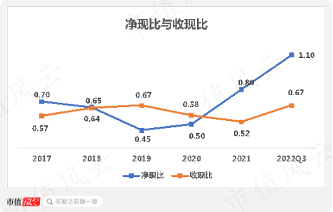 2017-2022年前三季度公司不仅收现比长期小于0.7,净现比也较差,经营性现金流净额常年小于净利润。