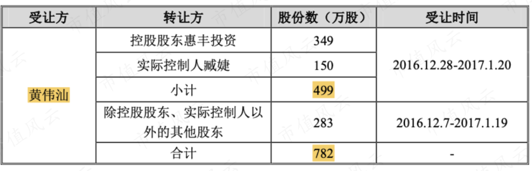有意思的是,公司招股说明书中披露,早在2016年底,黄伟汕就从公司控股股东和实控人妻子那儿受让了499万股,截至目前其持有公司2392万股,占流通股7.57%。