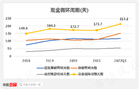 2022年前三季度存货周转天数和应收账款天数均呈上升态势,完成一轮购、存、销需要213天,压力还是挺大的。