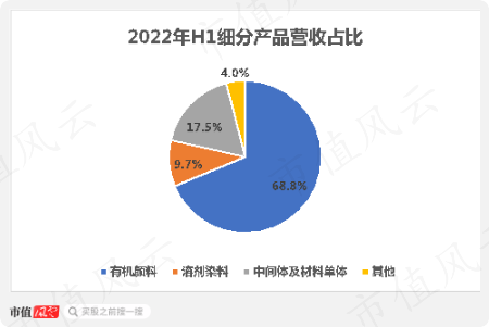 公司营收由三大块组成,2022年上半年近7成收入来自高性能有机颜料业务,另外两个业务分别是溶剂染料系列和中间体系列。