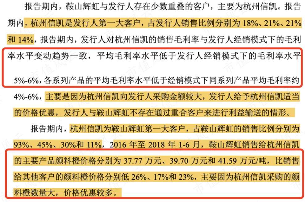 公司称给予杭州信凯优惠是其采购金额较大,而同期鞍山辉虹对杭州信凯的销售价格比给其他客户低17%-26%。