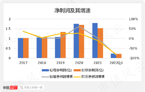 2021年扣非净利润同比增速开始下滑,2022年前三季度甚至同比大幅下滑81.1%。