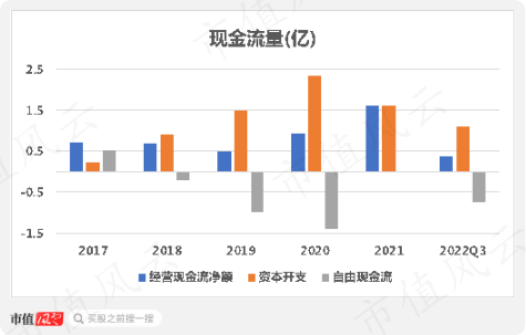 2017-22年前三季度,公司通过经营活动共产生了4.8亿现金流入,资本开支7.6亿,最终自由现金流净流出2.8亿,现金流吃紧。
