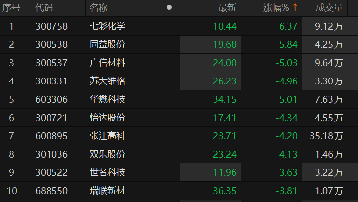 9月14日,光刻机板块走低,截至9时36分,七彩化学跌超6%,同益股份、广信材料等跌超5%。