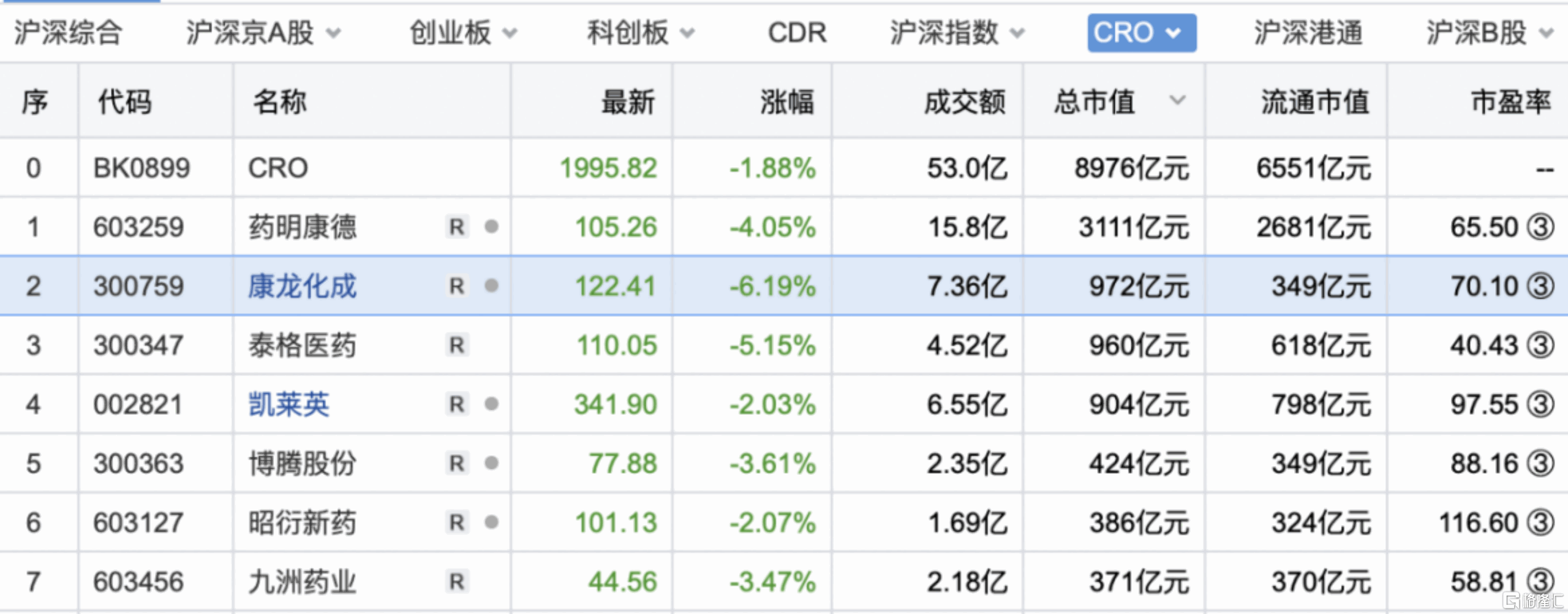 康龙化成于 2004 年在北京设立,目前已成长为一家全流程一体化医药研发生产服务龙头公司。受大股东减持消息影响,今日开盘康龙化成股价低开低走,截止午间收盘6.19%大跌,并且成功带崩CXO板块。