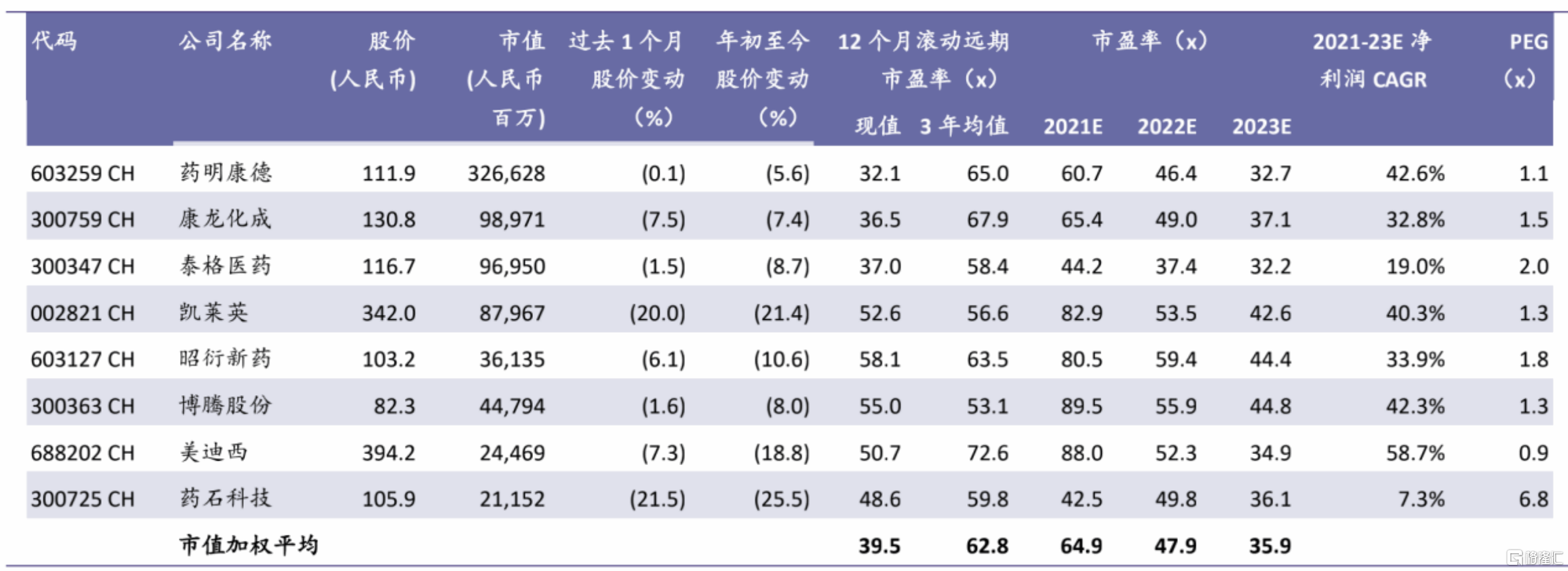 另外昨天凯莱英也发布了业绩预告,符合市场预期。公司2021年实现营业收入45.05~46.62亿元,同比增长43%~48%,其中Q4单季度实现营业收入16.75~17.30亿元,同比增长57%~62%,另外公司2021年实现扣非净利润9.08~9.40亿元,同比增长41%~46%,其中Q4单季度为3.12~3.44亿元,同比增长66%~83%,业绩呈现高速增长的趋势。