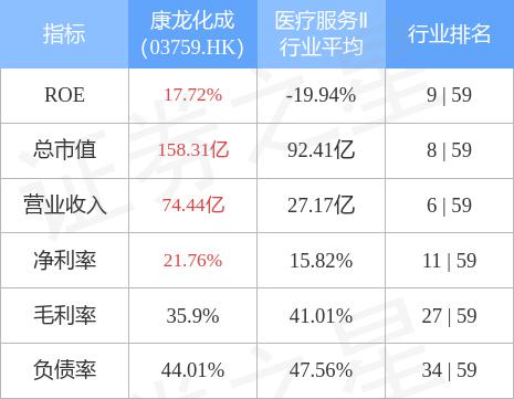 康龙化成市值 158.31 亿元,在医疗服务Ⅱ行业中排名第 8。主要指标见下表: