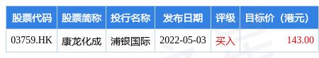 截至 2022 年 7 月 15 日收盘,康龙化成( 03759.HK )报收于 74.8 元,下跌 5.02%,换手率 0.51%,成交量 102.11 万股,成交额 7723.73 万元。投行对该股的评级以买入为主,近 90 天内共有 1 家投行给出买入评级,近 90 天的目标均价为 143。浦银国际最新一份研报给予康龙化成买入评级,目标价 143。