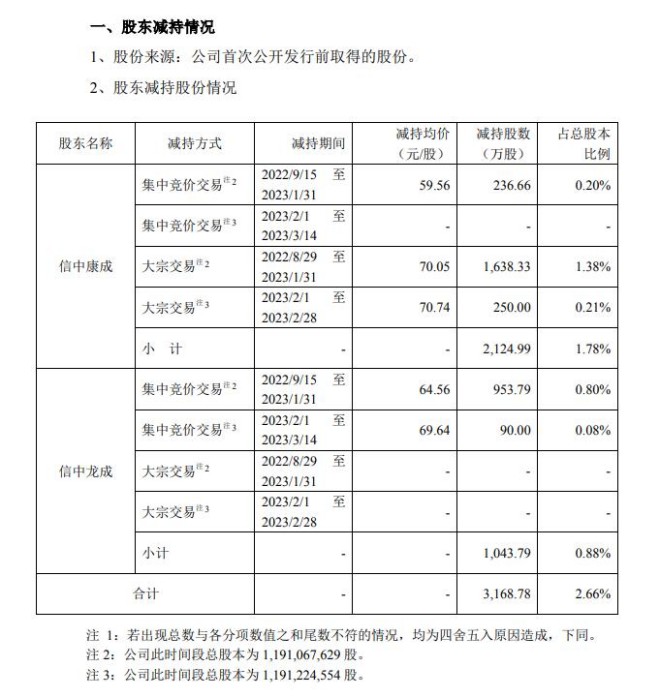 股东信中龙成持有3095.94万股(占公司总股本的2.60%),计划以大宗交易、集中竞价交易、协议转让等方式减持不超过2382.44万股(占公司总股本的2.00%),占其持有股份数量的76.95%。