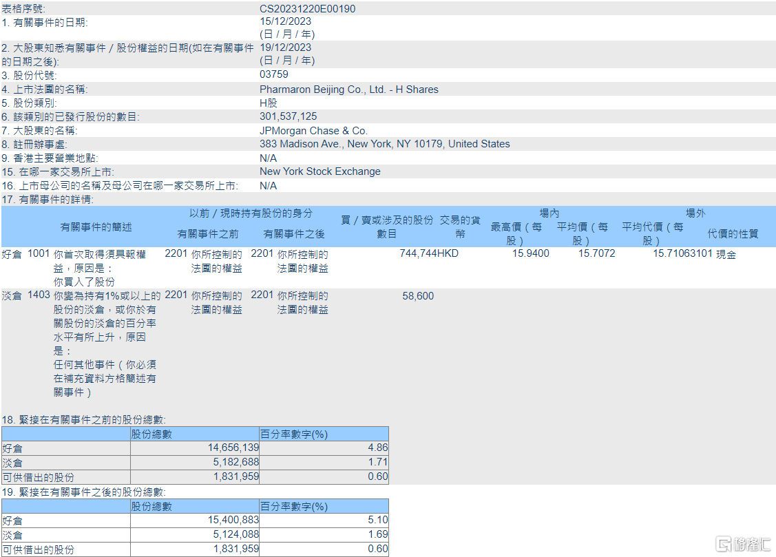 格隆汇12月21日丨根据联交所最新权益披露资料显示,2023年12月15日,康龙化成(03759.HK)获JPMorgan Chase & Co.以每股均价15.7072港元增持好仓74.47万股,涉资约1169.78万港元。