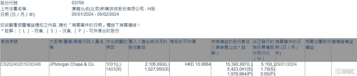 格隆汇2月5日丨根据联交所最新权益披露资料显示,2024年1月29日,康龙化成(03759.HK)获JPMorgan Chase & Co.以每股均价10.8664港元增持好仓210.69万股,涉资约2289.43万港元。