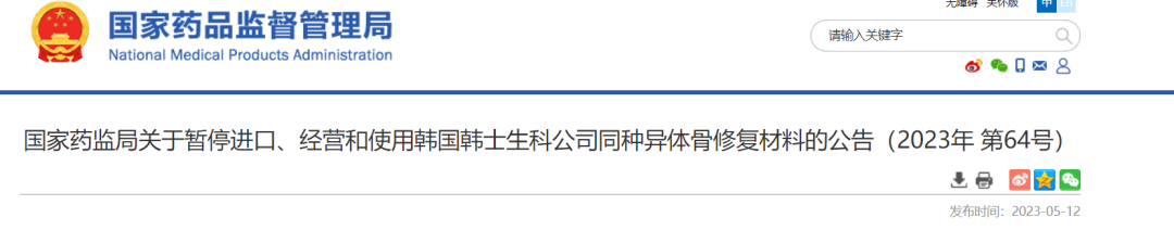 为保障公众用械安全,根据《医疗器械监督管理条例》和《医疗器械生产监督管理办法》有关规定,国家药监局决定自即日起,对韩国韩士生科公司的同种异体骨修复材料,暂停进口、经营和使用。