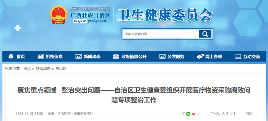 5月8日,广西自治区卫生健康委最新发布,卫健委与中医药局联合印发了《开展医疗物资采购腐败问题专项整治工作方案》(以下简称《方案》)。