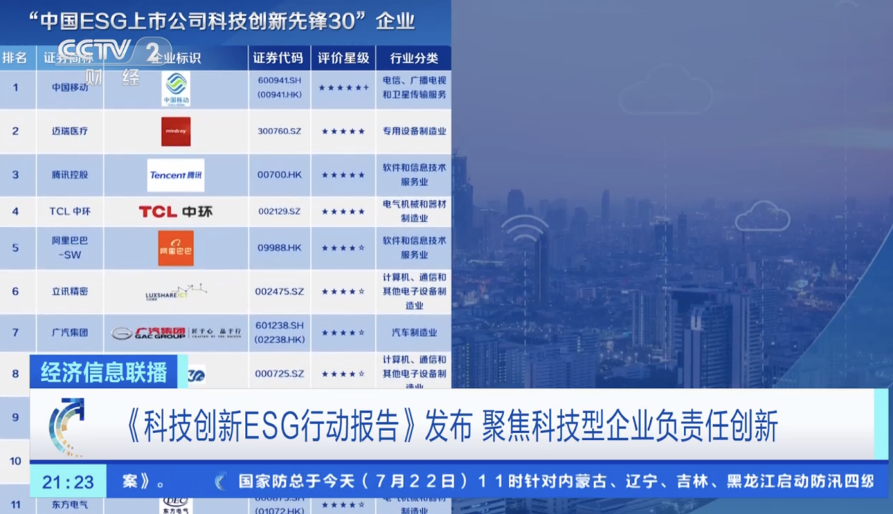 近日,央视财经节目中心隆重发布了《科技创新ESG行动报告》(以下简称《报告》)。在该报告中,以855家上市公司为样本池,在行业认定与研发投入满足一定标准基础上筛选出174家企业,经过系统科学评价,推出了“中国ESG上市公司科技创新先锋30”榜单。凭借在可持续发展方面的优秀管理与实践表现,迈瑞医疗再次获得积极肯定,以五星级评价成功入选该榜单,位列第二。