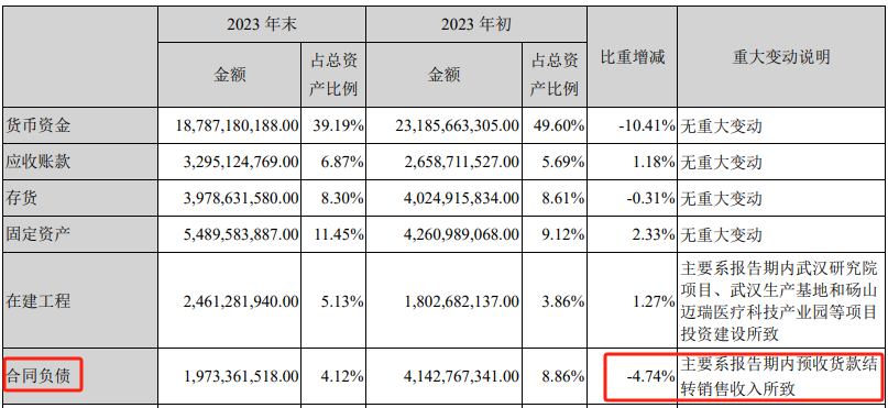 而到了2023年,迈瑞医疗营收增速跌至15.04%,预收款项(合同负债)却由上年的41.43亿元降至19.73亿元。在财报里,公司解释了变动原因:预收货款结转销售收入所致。这可能意味着,公司2023年释放了一部分此前囤积的利润。