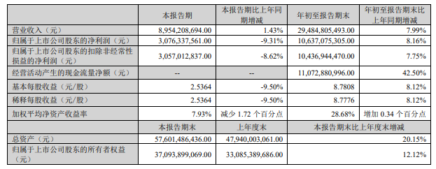 10月29日晚,迈瑞医疗发布2024年三季报。三季度,公司营业收入89.54亿元,同比增长1.43%;归属于上市公司股东的净利润30.76亿元,同比下降9.31%;归属于上市公司股东的扣除非经常性损益的净利润30.57亿元,同比下降8.62%。前三季度,公司营业收入294.85亿元,同比增加7.99%;归属于上市公司股东的净利润106.37亿元,同比增加8.16%。值得注意的是,迈瑞医疗上市以来首次出现单季度净利润同比下滑。
