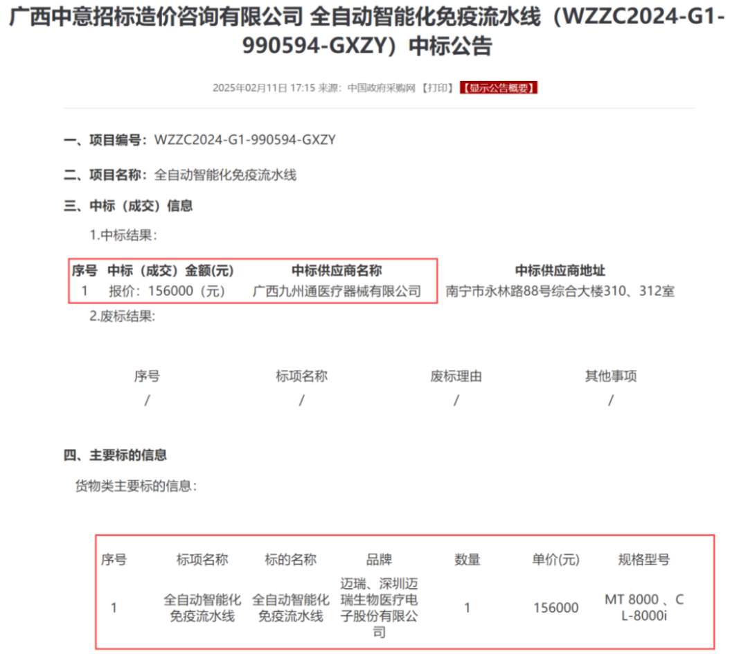 2025年2月,梧州市工人医院的全自动智能化免疫流水线采购中,迈瑞以15.6万元中标(预算214.8万元)。