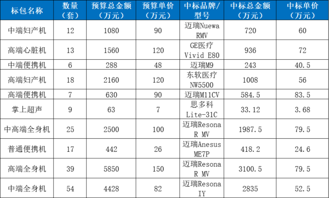 而迈瑞医疗在此次招标中成为了最大赢家之一,独揽 7 个标包,中标 160 套设备,总金额近 9900 万元,占比超 83%。