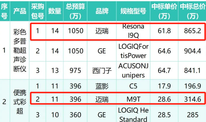 其中,其高端全身超声 Resona R MV 以 79.5 万元单价中标,较预算价 150 万元降幅达 47%,且该设备搭载弹性成像与 AI 辅助诊断功能,性能比肩外资高端机型。