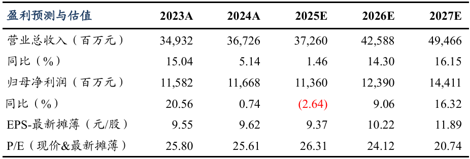 盈利预测与投资评级:考虑到海外推广费用及国内招投标情况,我们将公司2025-2027年归母净利润由119.60/131.31/152.80亿元调整为113.60/123.90/144.11亿元,对应当前市值的PE分别为26/24/21倍,考虑到公司海外发展顺利,维持“买入”评级。
