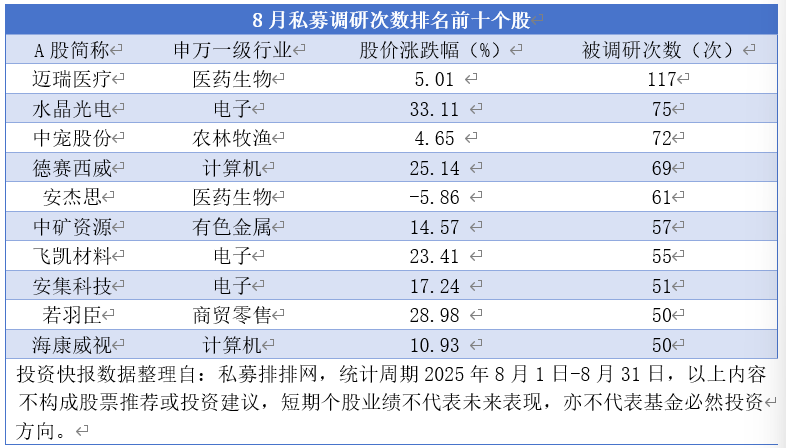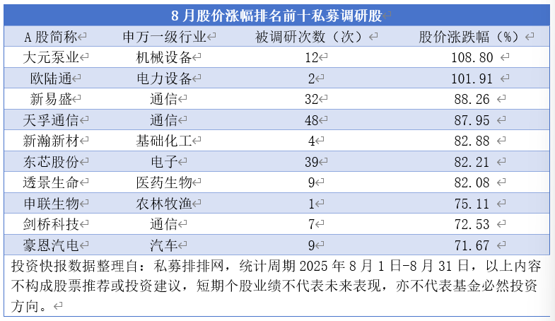 8月涨幅前十私募调研股中,通信、电子、电力设备等科技相关行业占比达50%,叠加机械设备、基础化工等制造业,成长属性显著的行业合计贡献8只个股,反映私募对高景气度成长赛道的重点关注。