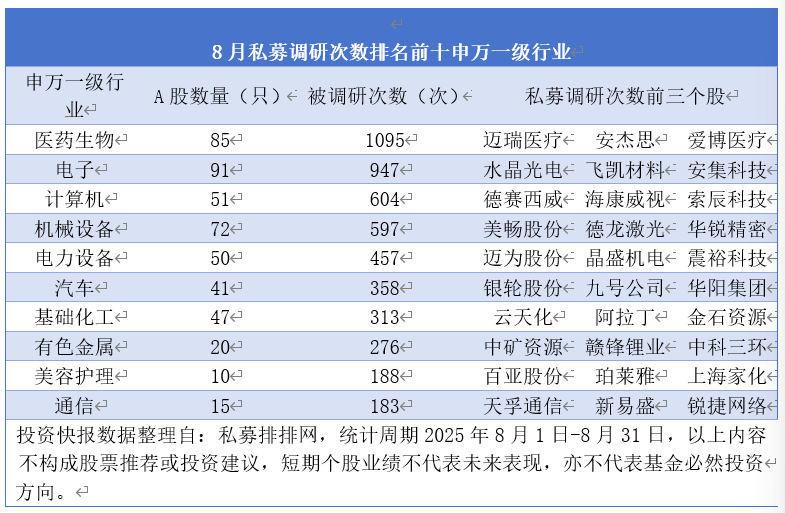 从8月私募调研行业分布来看,医药生物与电子行业“断层领先”。医药生物行业被调研1095次,被调研个股数量高达85只,成为本月最受私募调研关注行业,调研前三个股为迈瑞医疗、安杰思、爱博医疗,均为细分领域龙头。