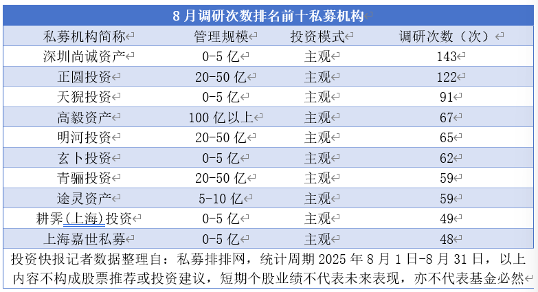 此外,8月调研次数排名前十的私募机构均以“主观”投资为主,暂无纯量化私募机构入围。
