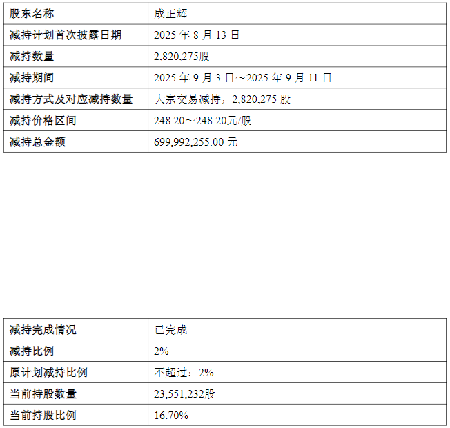 昨日晚间,惠泰医疗发布了关于持股5%以上股东权益变动触及1%刻度暨减持股份结果的公告。该公告显示,2025年9月3日至2025年9月11日期间,公司副董事长、总经理成正辉先生通过大宗交易方式累计减持公司股份2820275股,占公司股份总数的2%。成正辉先生的减持价格为248.20元/股,减持总金额接近7亿元。本次减持计划完成后,成正辉先生的持股比例降低至16.70%。