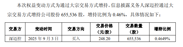 根据惠泰医疗2025年9月5日发布的关于股东权益变动的提示性公告,深迈控于2025年9月3日通过大宗交易方式增持公司股份655536股,增持比例为0.46%。深迈控9月份的两次增持股份数量和成正辉先生减持股份数量完全一致。由此来看,成正辉先生减持的所有股份皆被深迈控买走。而同花顺交易软件显示,深迈控9月份进行了两次增持,增持股份数量也和成正辉先生减持股份数量完全一致。