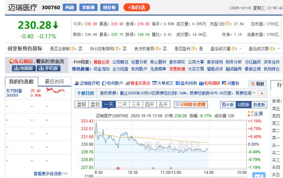 赴港上市靴子落地后,近三个交易日股价连续下跌的迈瑞医疗10月15日迎来开门红,但随后又波动下跌,截至下午14时,迈瑞医疗报230.28元/股,跌幅0.17%。总市值2792亿元。
