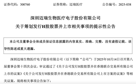 《星岛》记者获悉,迈瑞医疗在10月14日召开了第八届董事会第十四次会议,审议通过了多份拟发行H股股票并在香港上市的相关议案、方案等,包括聘请安永为上市专项审计机构。但目前上市具体细节未最终确定,且相关发行并上市尚需提交迈瑞医疗股东会审议,并取得相关部门的批准审核。