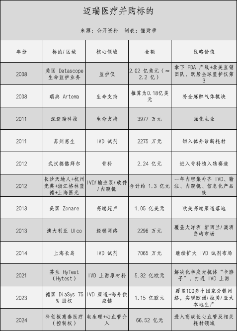2011年-2014年,迈瑞医疗密集并购十余家国内公司,包括深科股份、苏州惠生、浙江格林蓝德、长沙天地人、杭州光典、武汉德骼拜尔、北京普利生、上海医光、上海长岛等,补齐了IVD、输注泵、骨科、内镜等产品线。