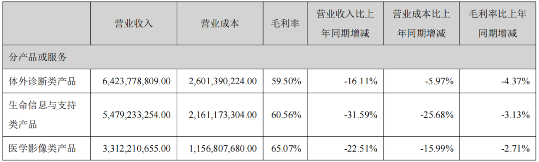其中,生命信息与支持产线业务营收54.79亿元,同比下降31.59%,毛利率60.56%,下降3.13个百分点。