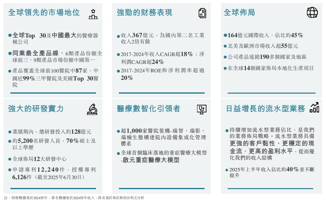 据招股书,迈瑞医疗是全球领先、创新驱动的世界级医疗器械企业及医疗数智化引领者。根据弗若斯特沙利文的资料,在中国医疗器械行业,公司2024年的市值规模超过境内主要龙头企业(第二到五名)之和,工业收入是第二名的两倍有余。