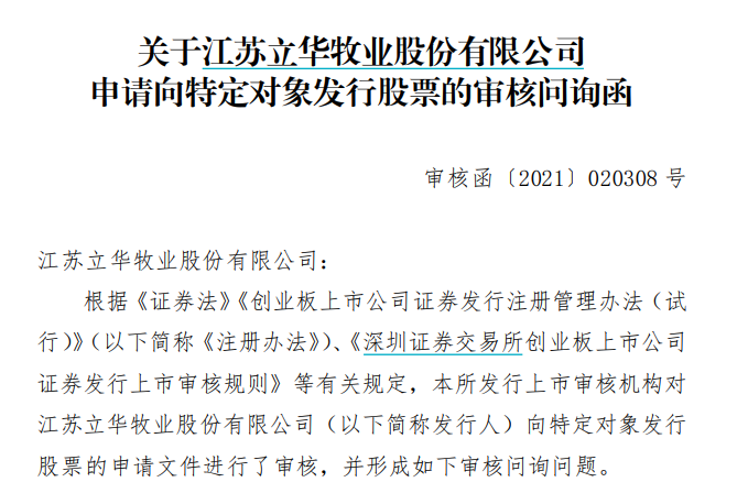 立华股份12月16日晚间公告称,公司收到深交所关于定增审核的问询函,深交所要求公司说明存货跌价准备的计提、转回的依据及合理性、募投项目中自筹资金部分的筹资计划等多个问题。值得一提的是,立华股份曾于今年3月申报20亿元可转债发行案,并在深交所三轮问询后终止申请,本轮定增能否成功获批值得留意。