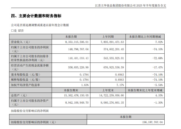 日前,立华股份(300761.SZ)发布2025年半年度报告。根据报告,2025年上半年,立华股份实现营收83.53亿元,同比增长7.02%;归母净利润1.49亿元,同比下滑74.10%,扣除非经常性损益后,净利润同比仍下滑72.68%。此外,现金流方面,立华股份上半年经营活动产生的现金流量净额同比减少17.47%至5.59亿元。