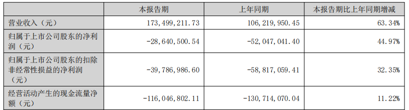 公司2024年实现营业收入3.53亿元,同比增长12.97%;归属于上市公司股东的净利润-1.24亿元,2023年同期为-1.90亿元;归属于上市公司股东的扣除非经常性损益的净利润为-1.50亿元,2023年同期为-2.25亿元;经营活动产生的现金流量净额-1.07亿元,2023年同期为-3.04亿元。